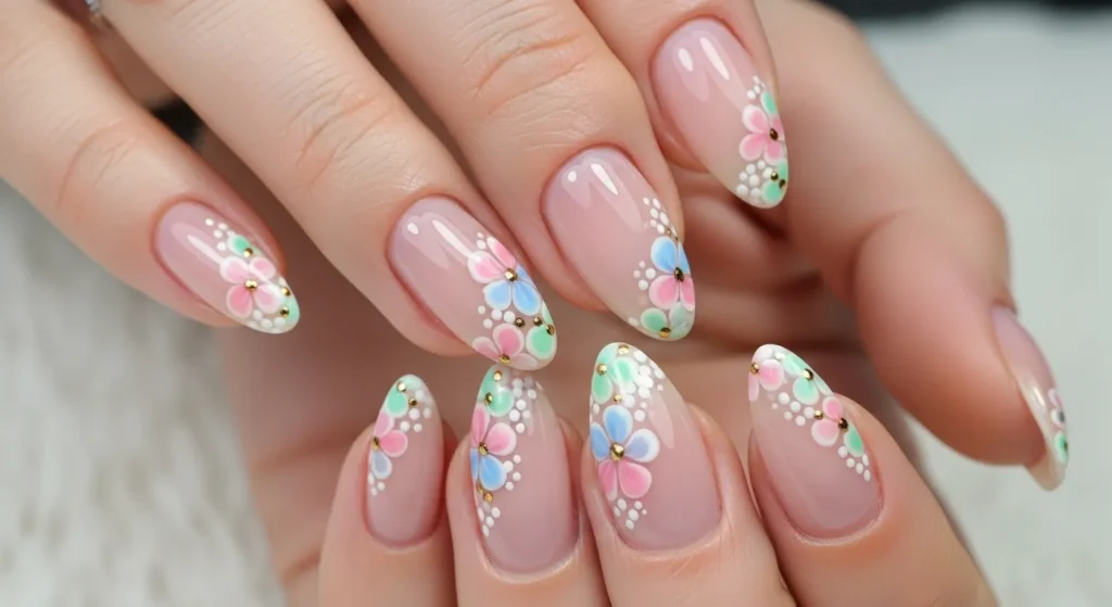 Designs like cute froggies or floral accents look amazing on almond nails.
