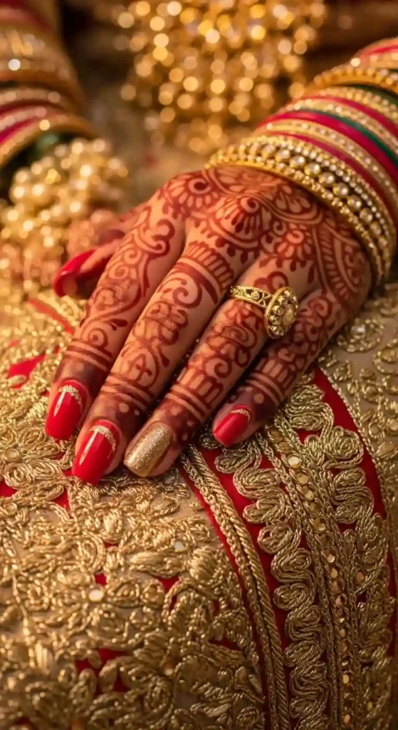 Deep red shades, gold glitter, and detailed designs are common choices for traditional weddings.