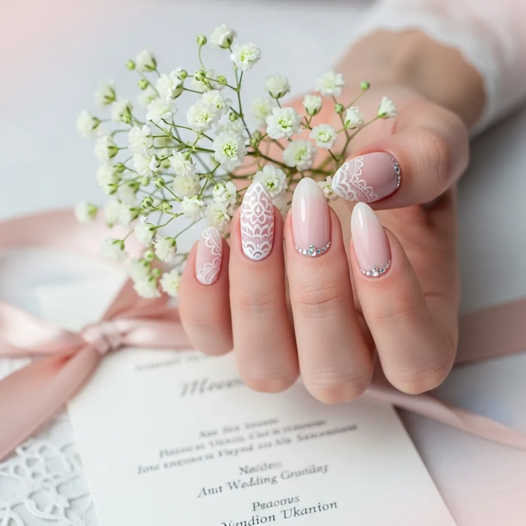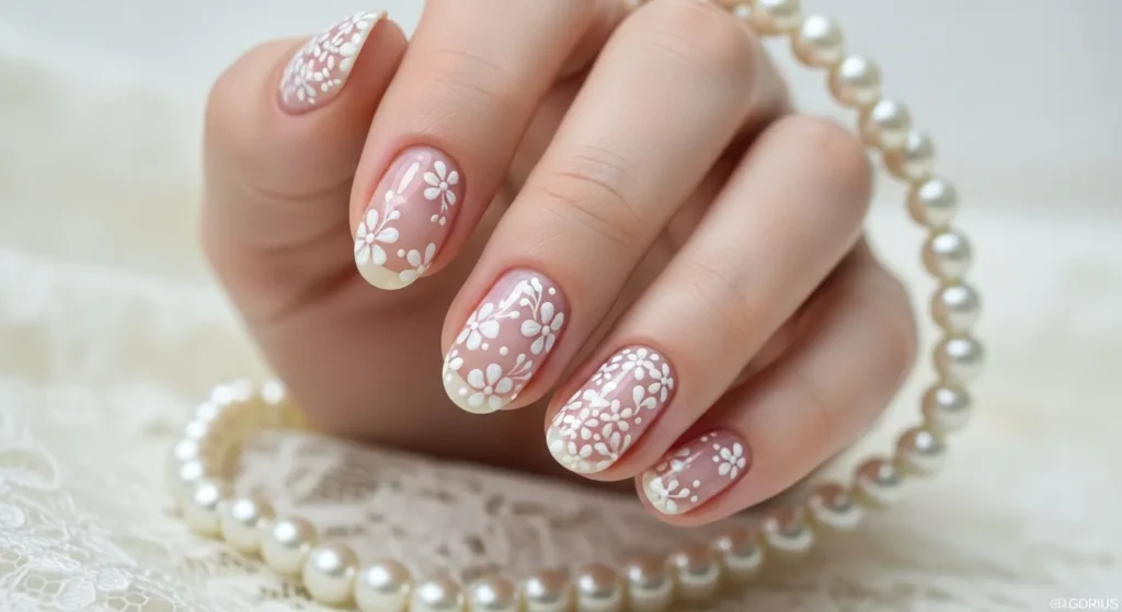 Wedding nail art designs often include delicate romantic patterns.