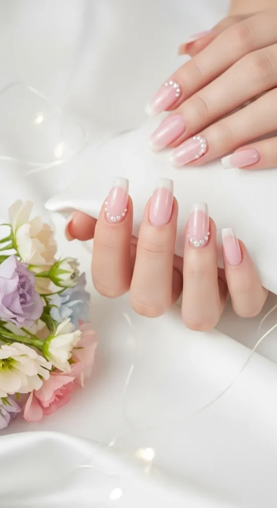 Sheer pink shades, glossy finishes, and small pearl decorations are popular choices.