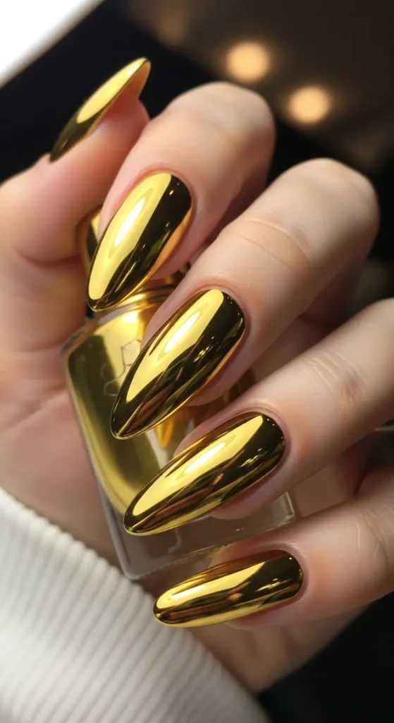 Gold chrome nails add a luxurious and elegant touch. The warm metallic shine makes them perfect for special occasions and glam looks.