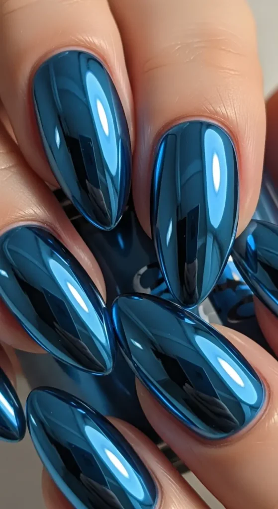 Blue chrome nails create a bold and modern manicure. The cool-toned metallic finish gives nails a unique futuristic look.