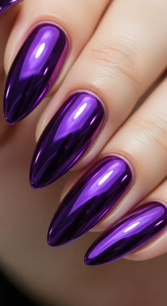 Purple chrome nails are vibrant and stylish. The metallic shine enhances the richness of the color, making it stand out.