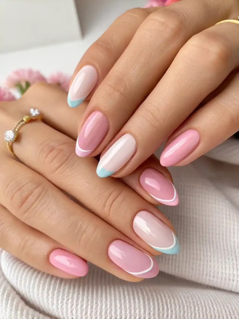 Almond-shaped French tip nails elongate the fingers and create a refined silhouette. This shape pairs beautifully with classic white tips, ombre effects, and soft pastel colors.