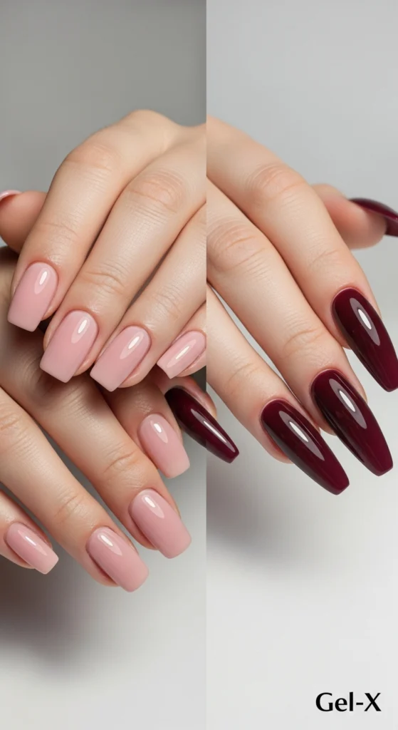 Gel nails usually keep your natural nail length or add slight structure. Gel-X provides instant long nails because the extensions are already shaped and applied directly.