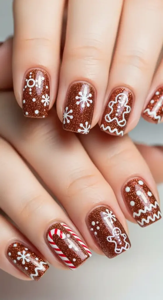 Nothing says holiday cheer like adorable gingerbread men dancing across your nails. This design usually features a warm brown base with white icing smiles and colorful candy buttons that instantly feel festive. It’s a timeless choice that looks cute on both short and long nail shapes.