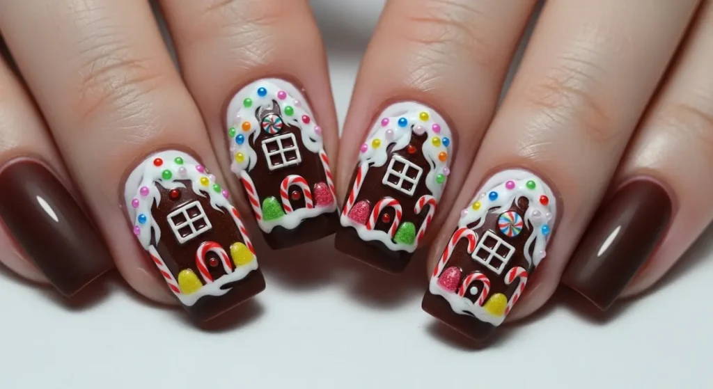 Tiny gingerbread houses with icing roofs and candy details turn your nails into mini holiday masterpieces. This design is more detailed but incredibly eye-catching when done well. It’s perfect if you love statement manicures during the festive season.