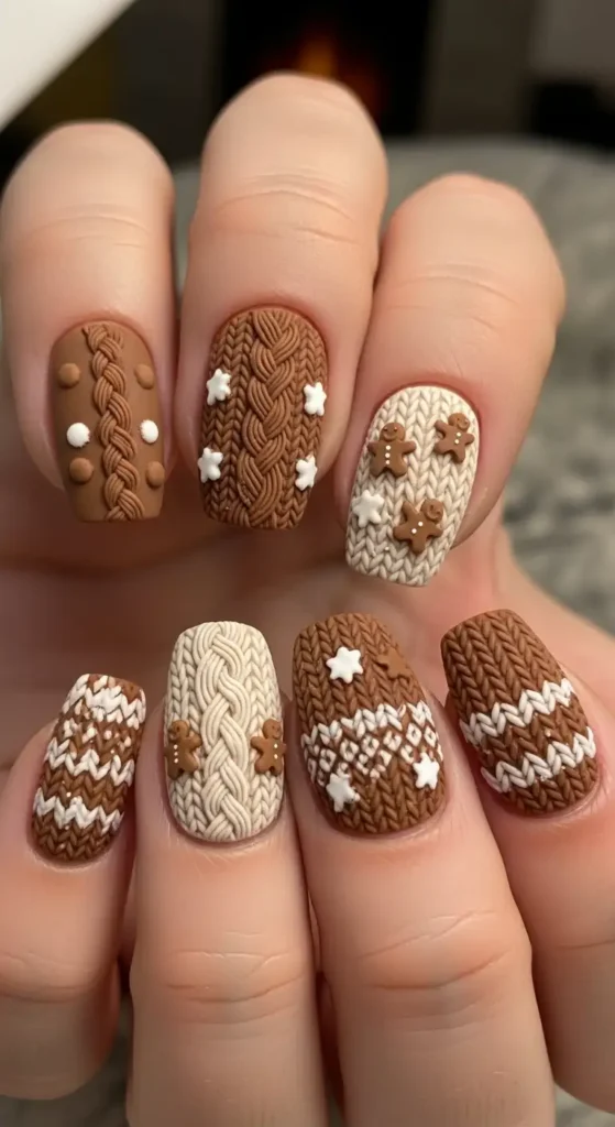 Inspired by cozy winter knits, this design combines gingerbread tones with sweater-style patterns. The textured look makes your manicure feel extra warm and seasonal. It pairs beautifully with neutral winter outfits.