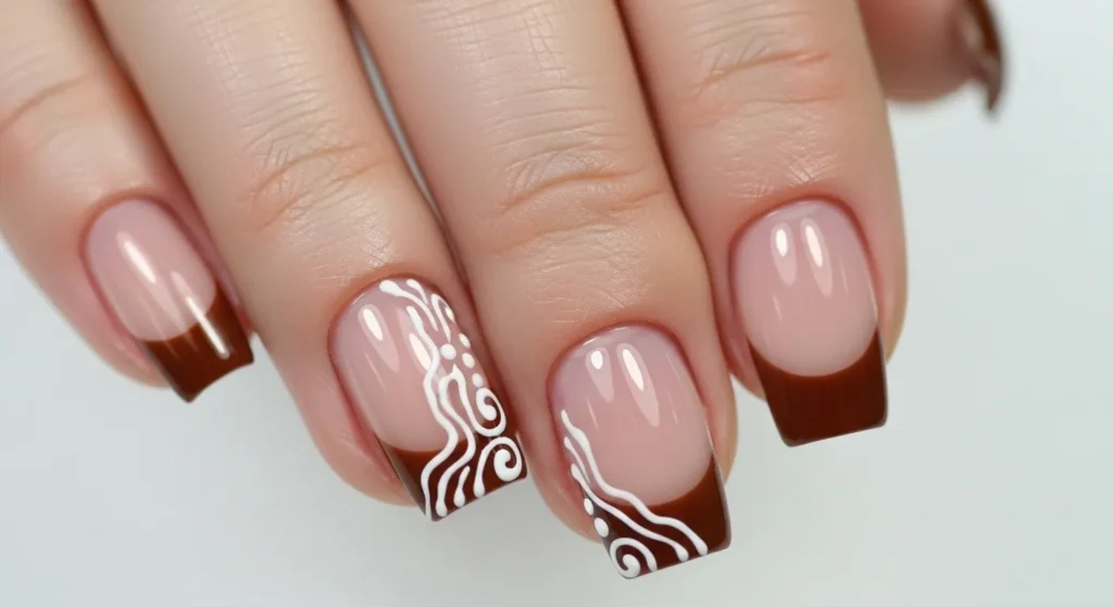 Give your traditional French manicure a holiday upgrade with gingerbread-colored tips and delicate icing lines. The nude base keeps the look classy while the festive tips add a sweet seasonal touch. It’s perfect if you want something subtle but still on theme.