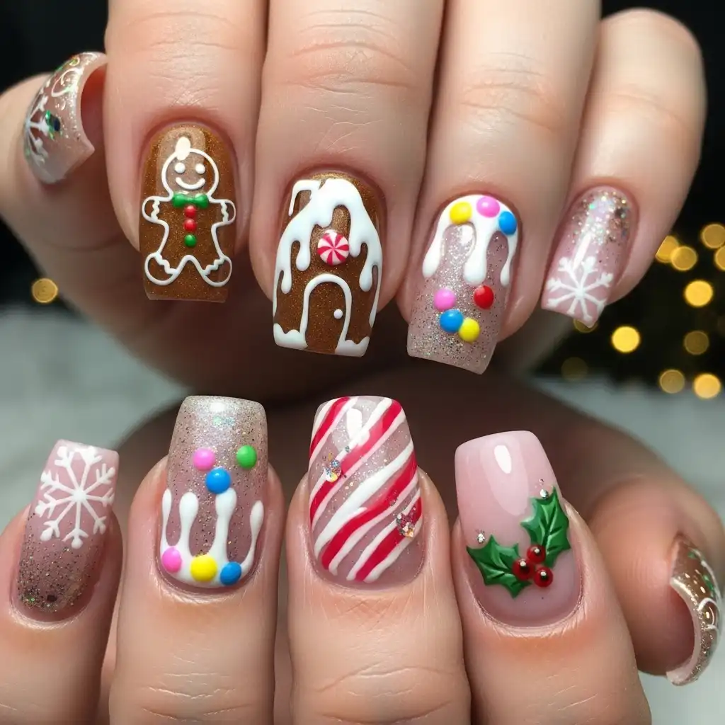 This playful style mixes gingerbread men with candy canes, icing swirls, and holiday sweets across different nails. The variety makes your manicure look fun and eye-catching without feeling overwhelming. It’s ideal for anyone who loves detailed, festive nail art.