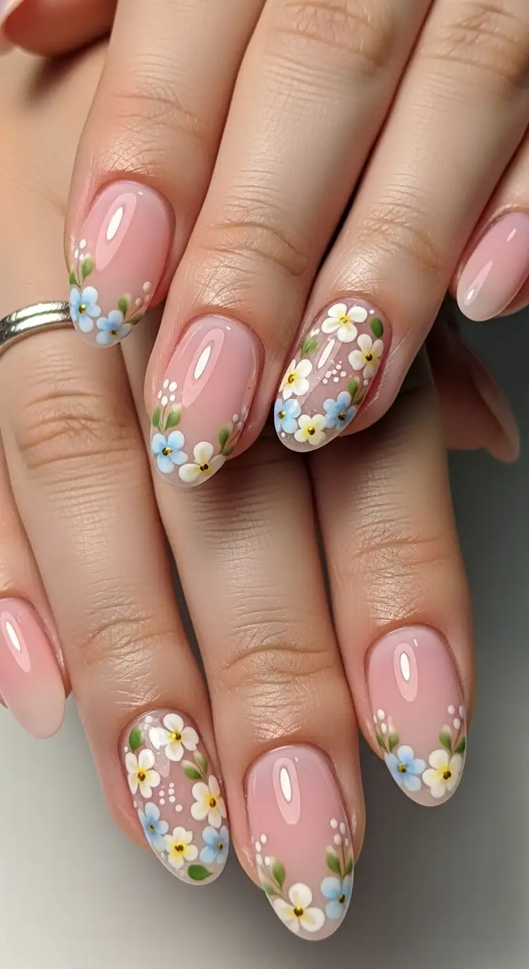 Delicate floral art adds a feminine decorative touch to the smooth obele shape. Soft petals over a nude base keep the design classy rather than busy. Perfect for spring and summer vibes.