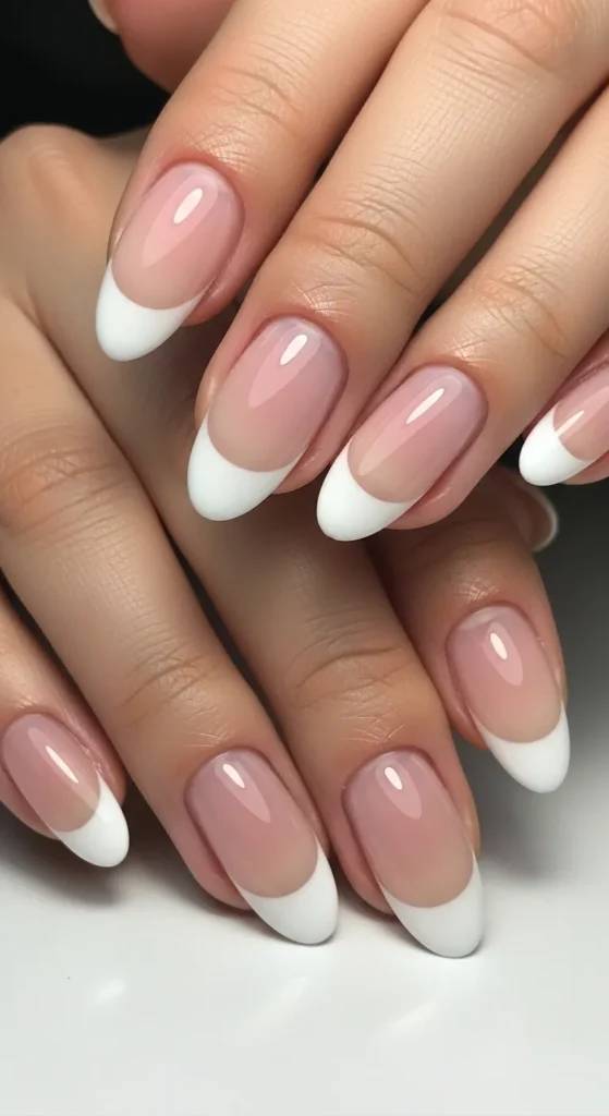 This design pairs the gentle obele shape with crisp white French tips for a refined look. The contrast between the nude base and white edge keeps the manicure fresh and polished. It’s ideal for work, events, or bridal styles.