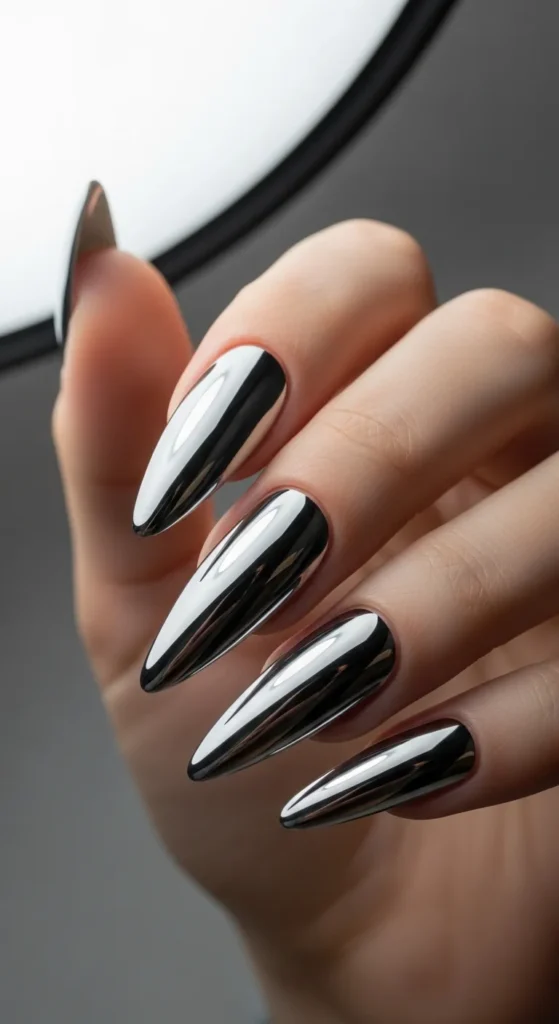 For a trendy upgrade, chrome polish adds a reflective shine to the soft obele shape. The mirror finish makes your nails stand out while the rounded tip keeps the look balanced. Perfect for fashion-forward styles.