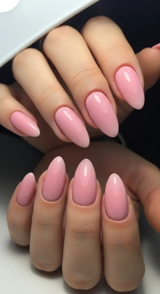 Soft blush pink polish gives the obele shape a romantic and feminine feel. The glossy finish enhances the smooth curves of the nail. It’s a go-to choice for date nights and spring looks.
