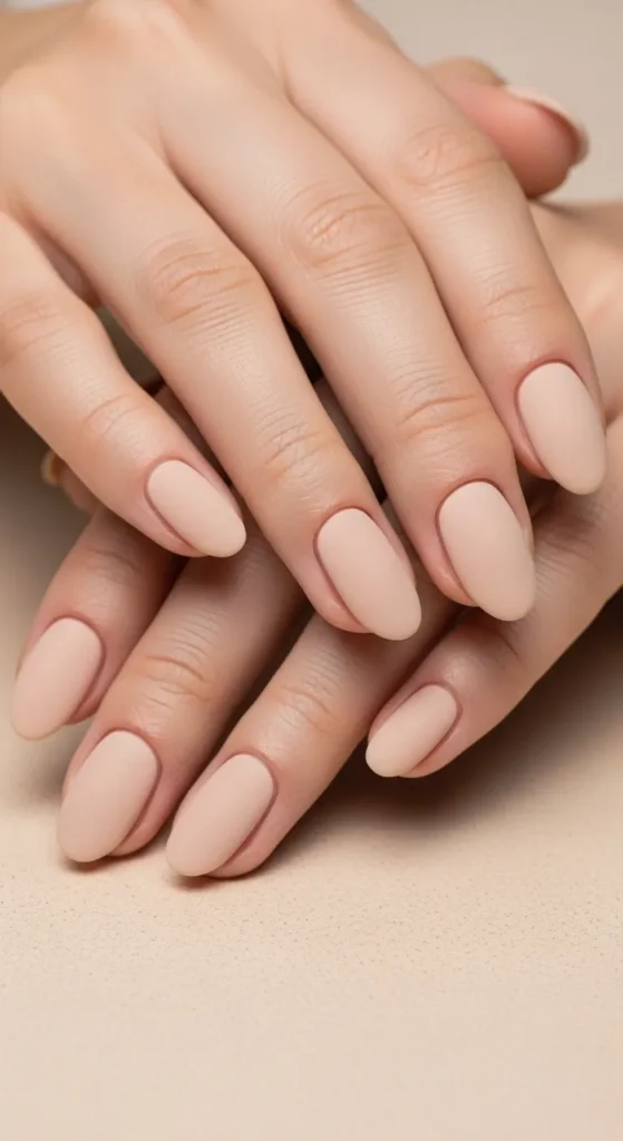 Matte nude polish creates a modern, velvety look on the obele shape. The lack of shine makes the silhouette of the nail stand out more clearly. It’s chic, minimal, and very on-trend.