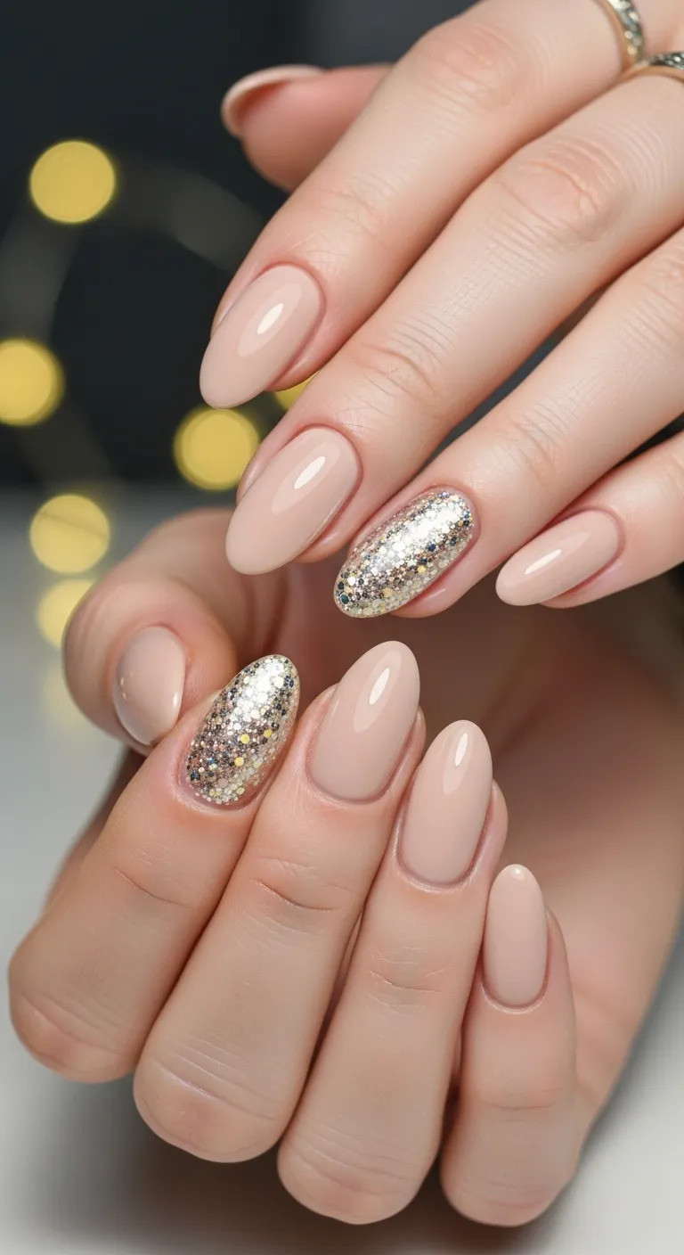 Add a touch of sparkle by pairing neutral obele nails with one glitter accent finger. This keeps the manicure elegant while still feeling festive. It’s perfect when you want subtle glam.