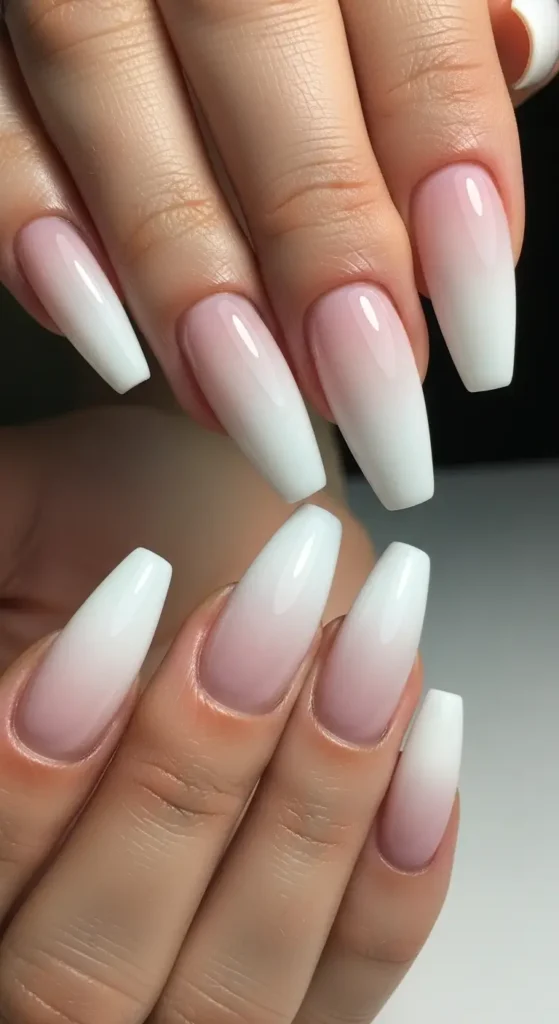 The soft pink-to-white ombre blends beautifully with the rounded obele tip. This design looks airy, clean, and bridal-ready. It’s a favorite for weddings and special occasions.