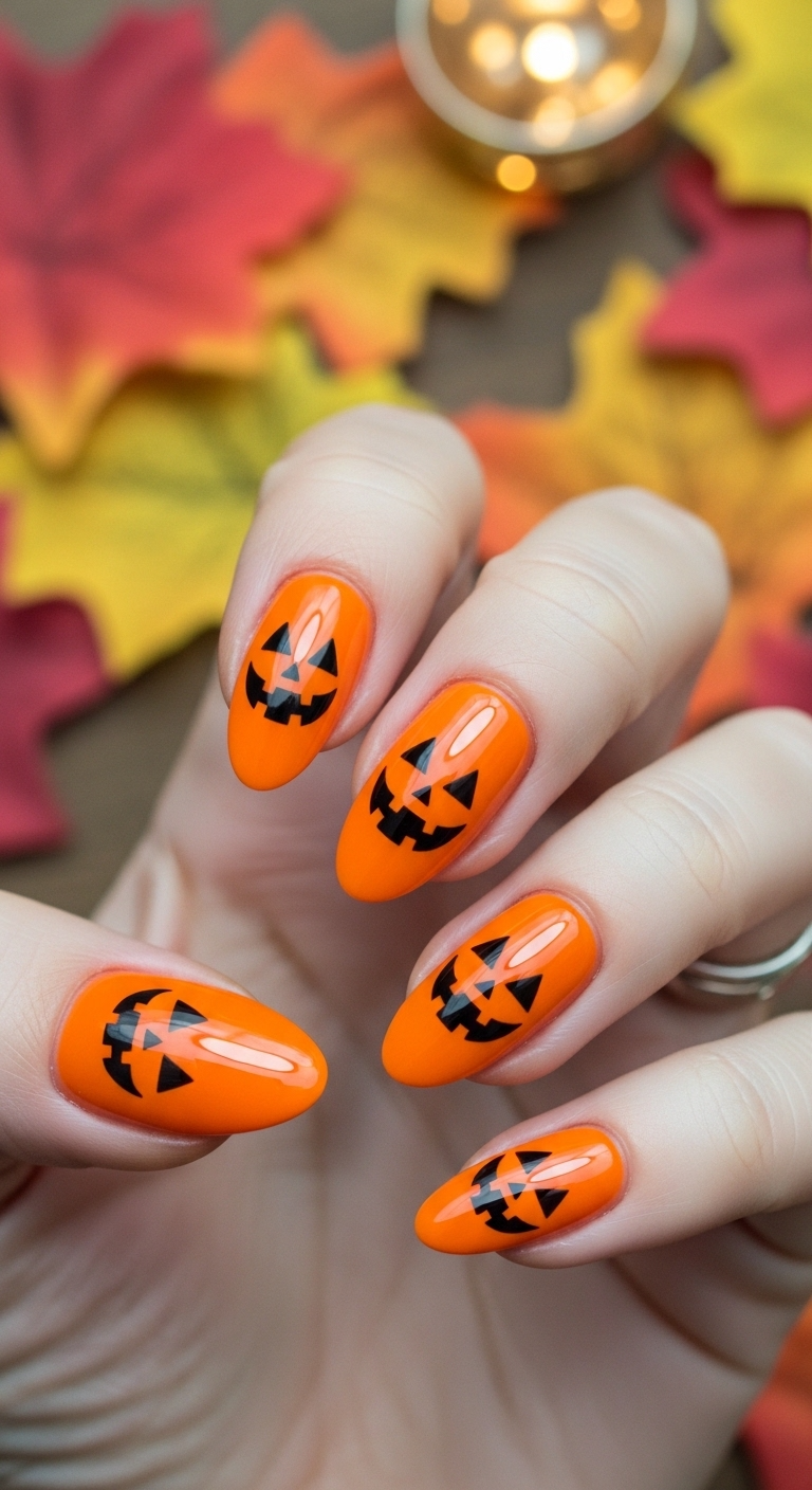 Nothing says October like pumpkins. Go for bright orange nails with tiny pumpkin art, or mix nude and orange shades for a subtle pumpkin patch vibe. Adding green or gold accents makes the design more festive.