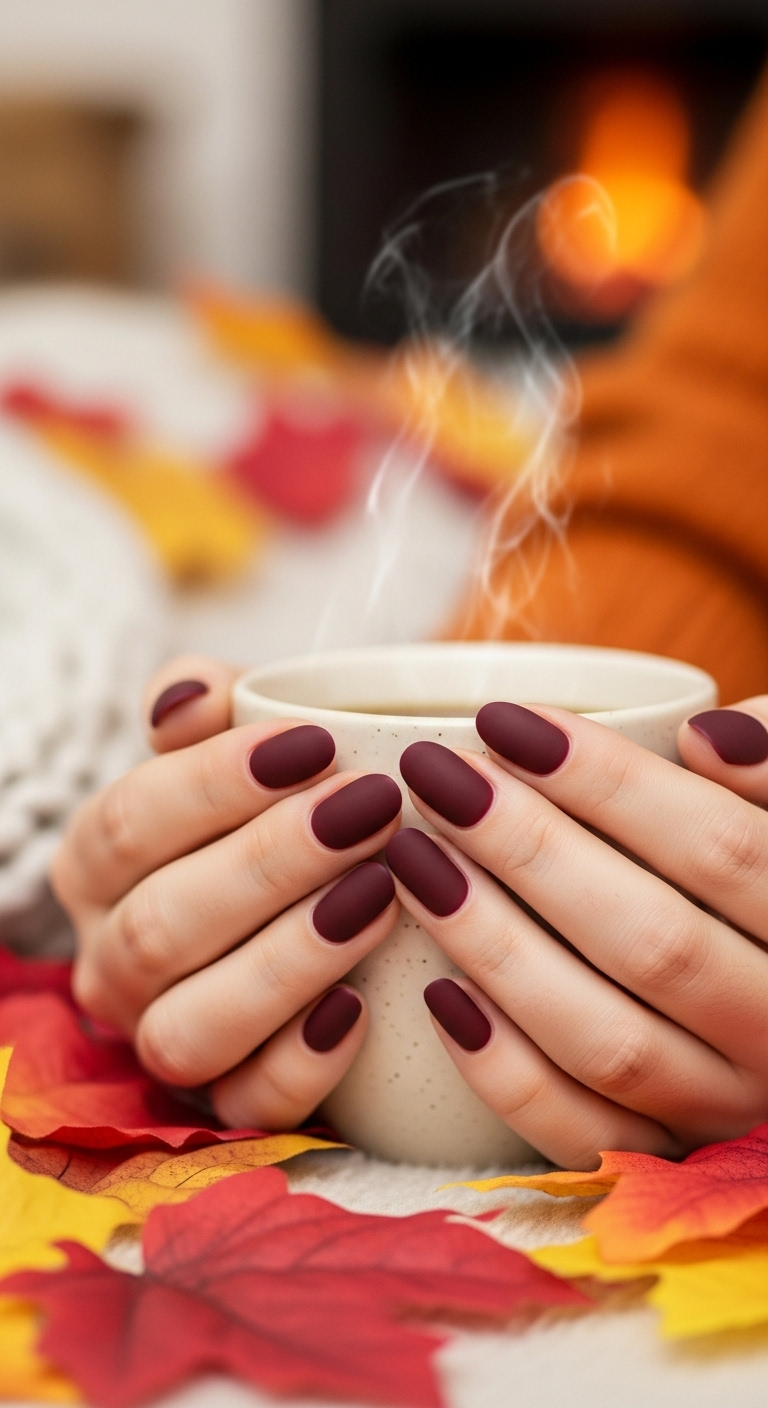 Burgundy is the ultimate fall shade. A matte burgundy manicure looks sophisticated and is perfect for both casual outings and formal events. Add gold tips or rhinestones for extra glam.