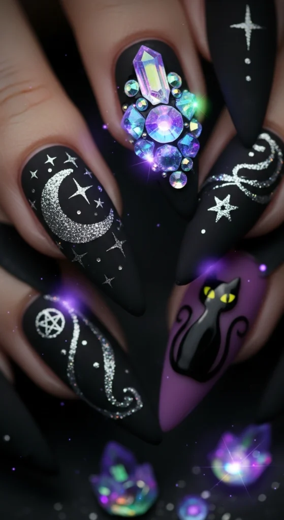 Channel your inner witch with mystical nail art. Think moons, stars, crystals, and black cats painted on dark bases. Perfect for anyone who loves witchcore aesthetics.