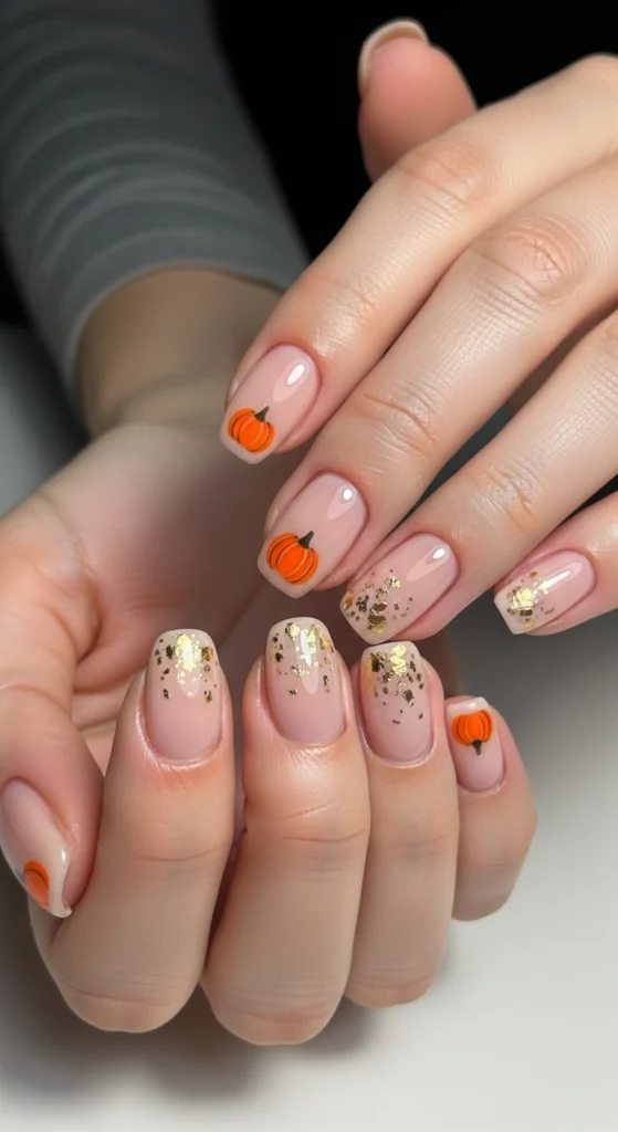 Not a fan of bold designs? Go for nude nails with subtle fall accents like tiny pumpkins, gold flakes, or matte tips. Minimal but very on-trend for October 2025.