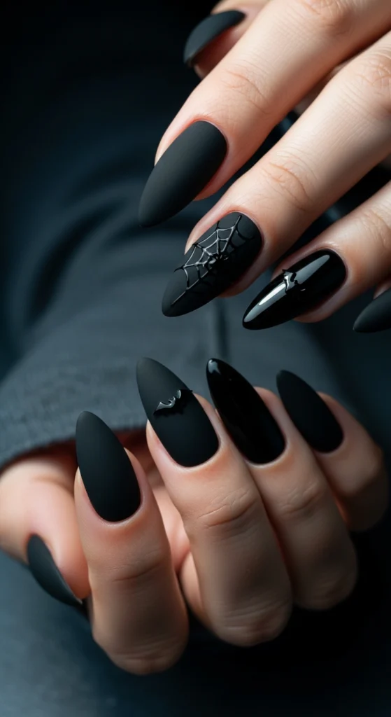 Black nails are always in style for October. You can keep them matte for a chic look or add Halloween elements like bats, ghosts, or spiderwebs. Black French tips are also trending this year.