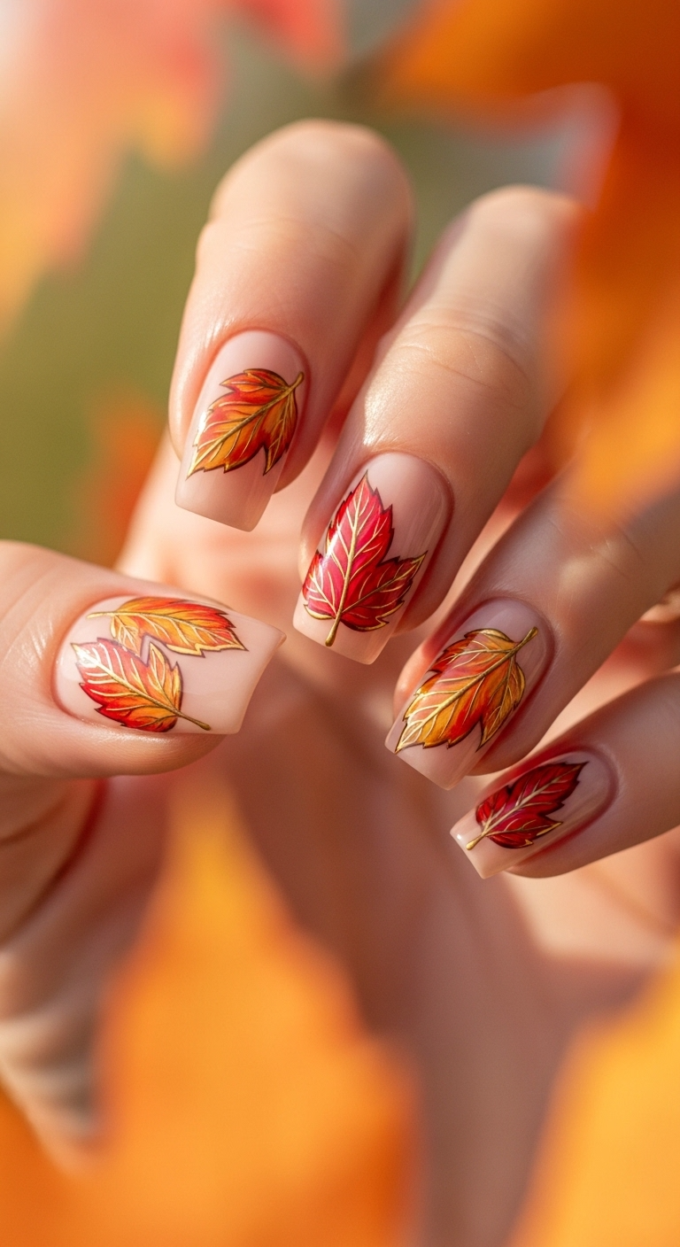 Bring the beauty of fall foliage to your nails with leaf nail designs in shades of red, gold, and brown. A clear or nude base makes the leaf art pop beautifully. Perfect for cozy October vibes.