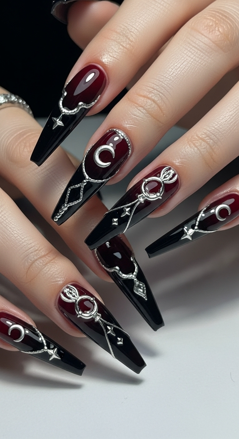 For those who love drama, gothic nails are a must. Think deep burgundy, dark purple, or black nails with silver accents, spiderwebs, or moon phases. They’re bold, mysterious, and perfect for Halloween parties.