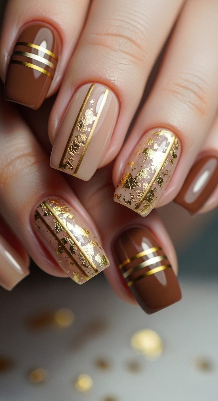 Gold instantly elevates your nail game. Combine gold foil or metallic stripes with earthy fall colors like deep green, brown, or maroon for a classy October look.