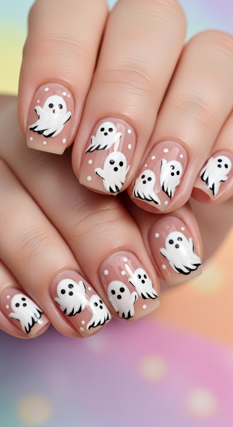 Not all Halloween nails have to be scary—cute ghost designs are perfect if you prefer fun over fright. White ghost art on pastel or nude bases looks adorable and Instagram-worthy.