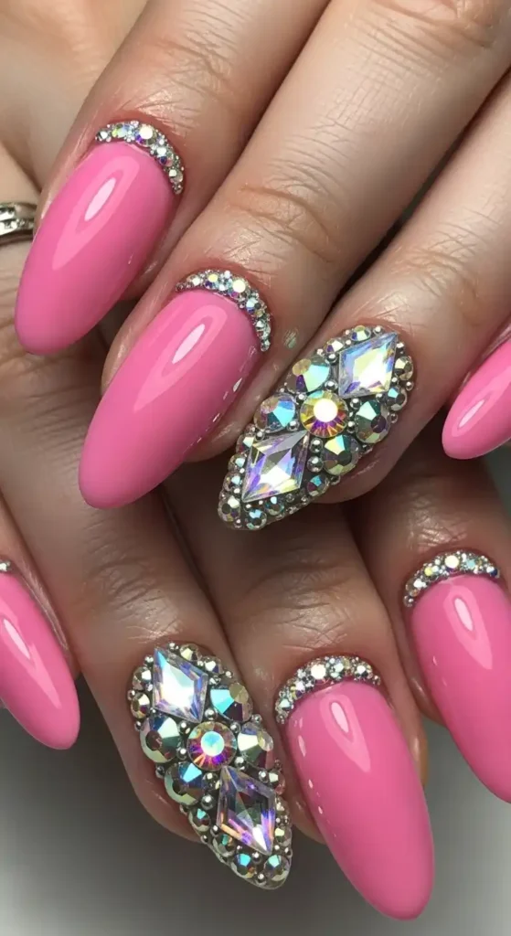 Adding rhinestones to pink nails creates a glamorous and eye-catching design. The sparkle adds a luxurious touch to your manicure.