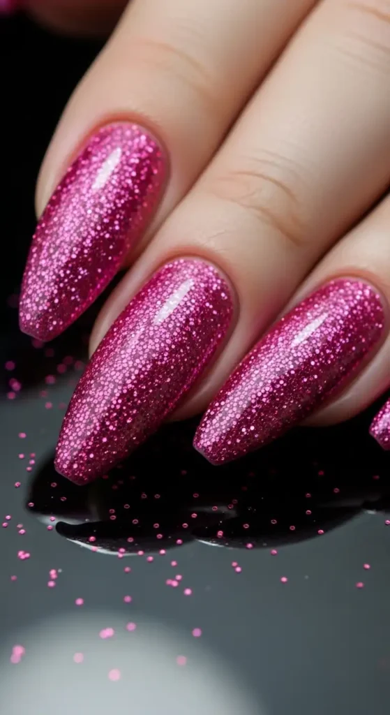 Glitter pink nails add sparkle and glamour to your look. Whether used on all nails or as an accent, the shimmer creates a festive and stylish effect.