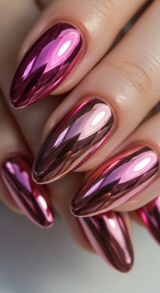 Chrome pink nails offer a metallic shine that looks modern and stylish. The reflective finish makes the color stand out even more.