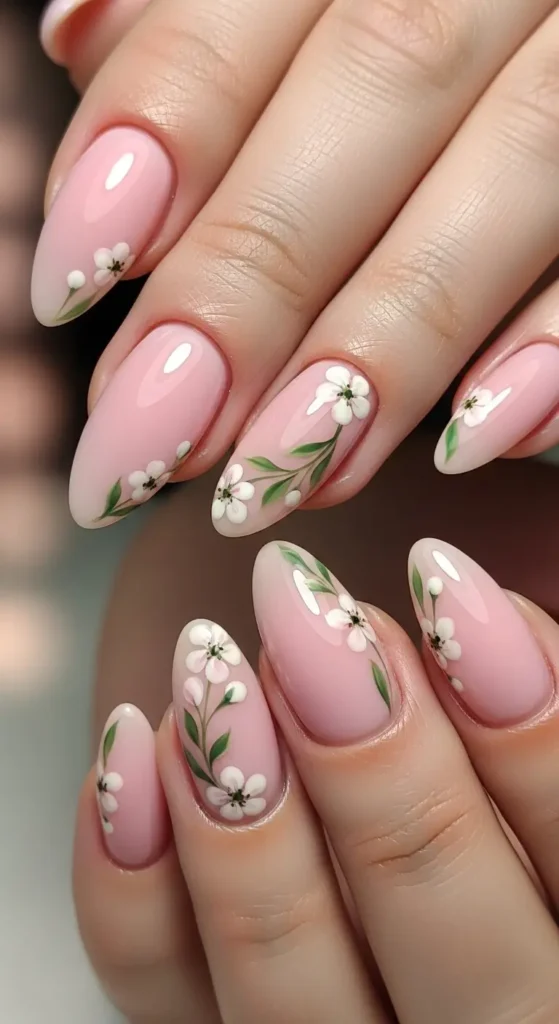 Floral designs on pink nails create a soft and romantic manicure. Small flowers add a delicate and feminine detail.