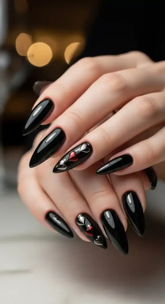 Glossy black polish creates a bold base that feels sleek and modern for Valentine’s Day. Adding subtle heart accents keeps the look romantic without overpowering the manicure.