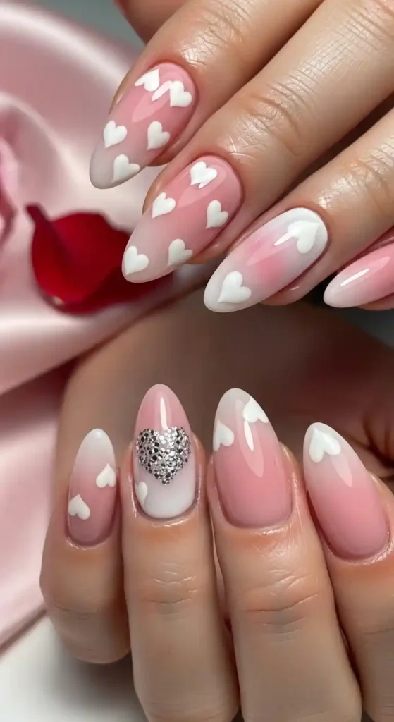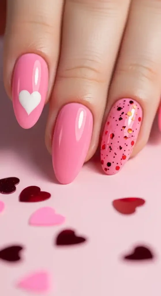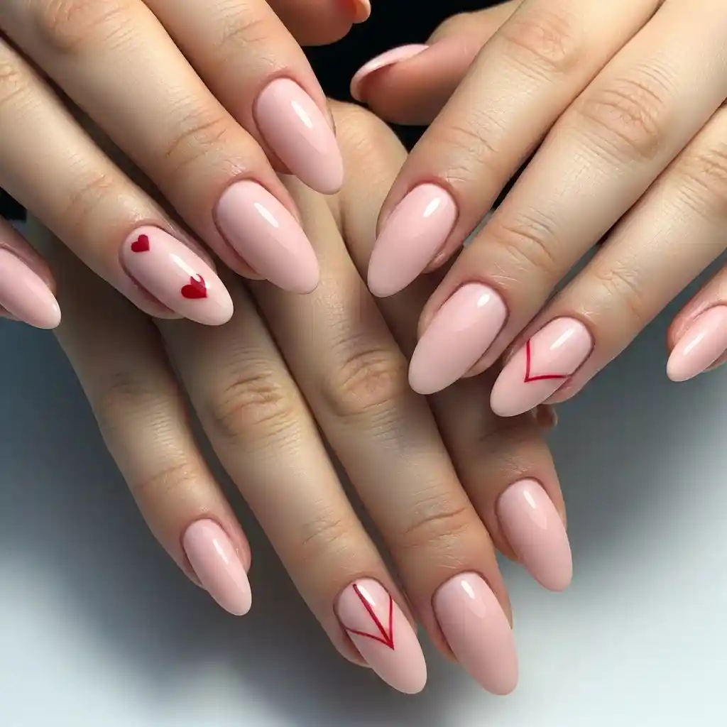 Blush pink nails are classic and feminine for Valentine’s Day. Romantic heart art enhances the softness while keeping the look sweet and wearable.