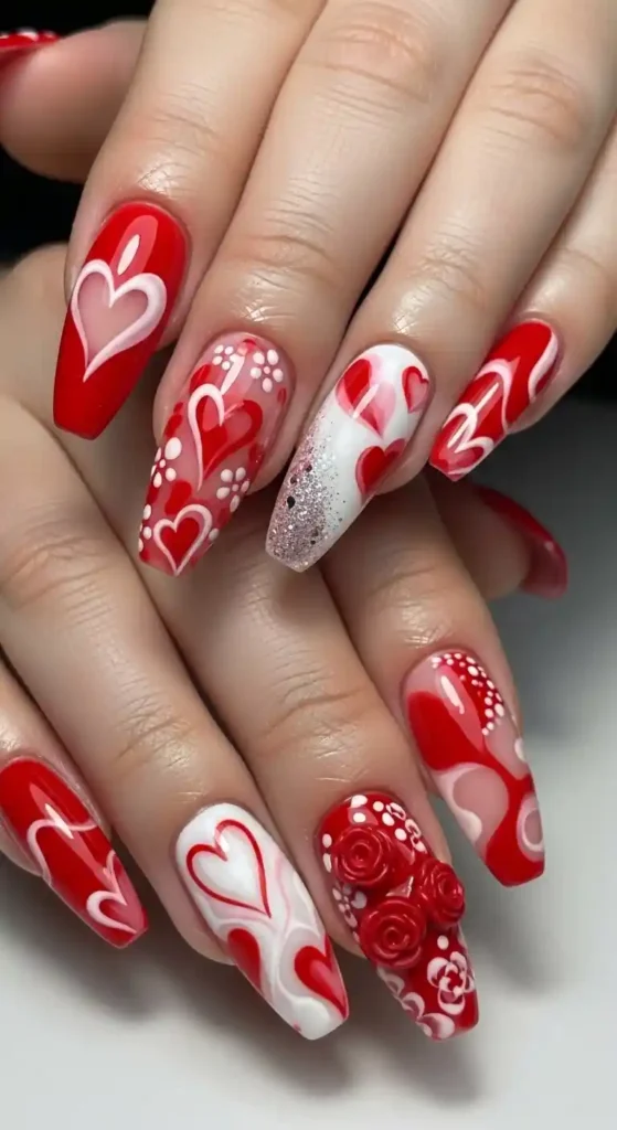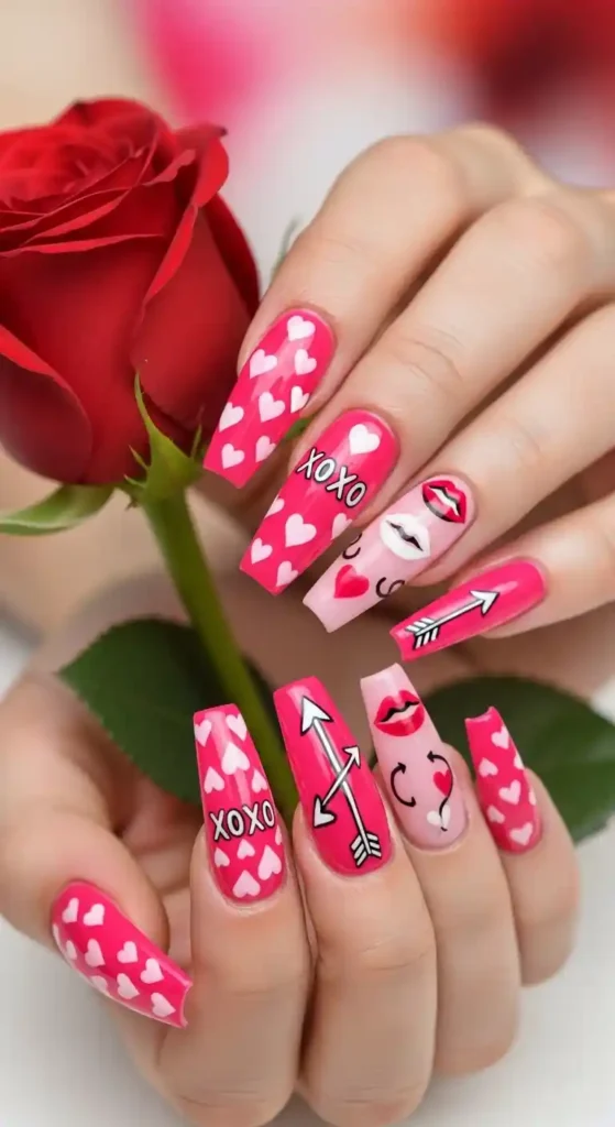 Creative acrylic nail art inspired by Valentine’s Day themes