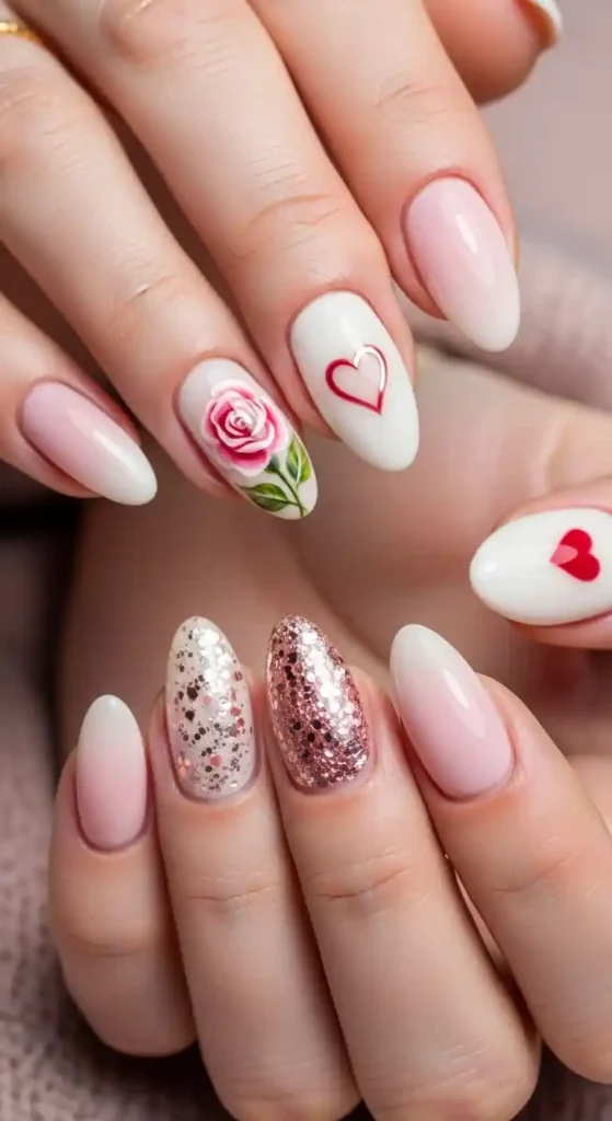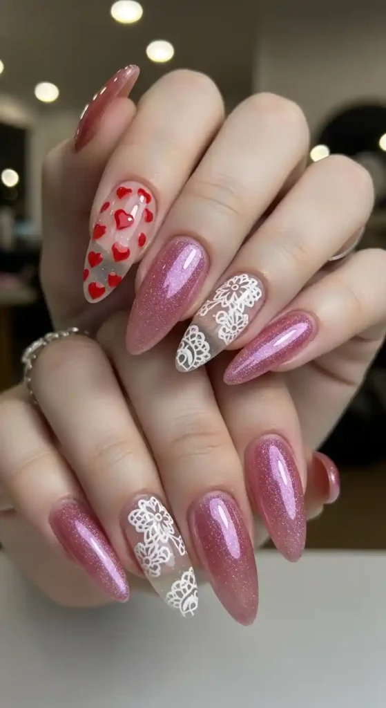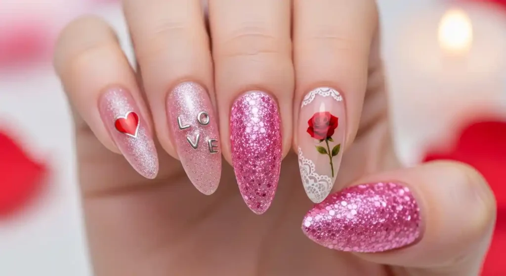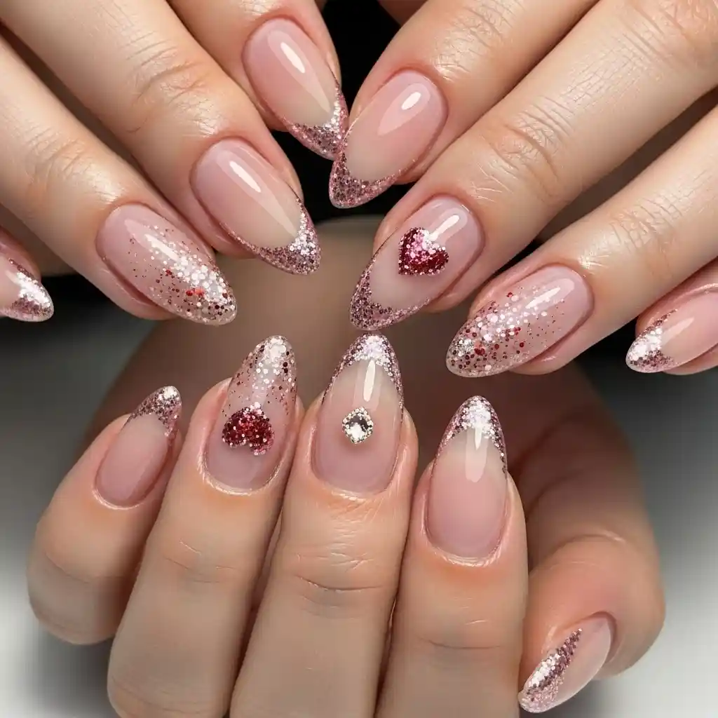Pink glitter nails combine romance and glamour effortlessly. Valentine details add charm without taking away from the sparkle.