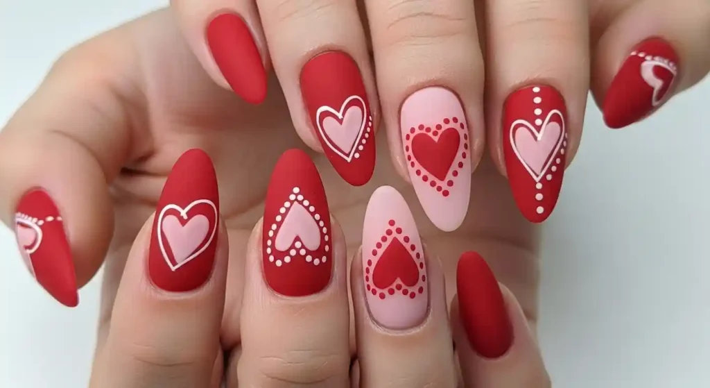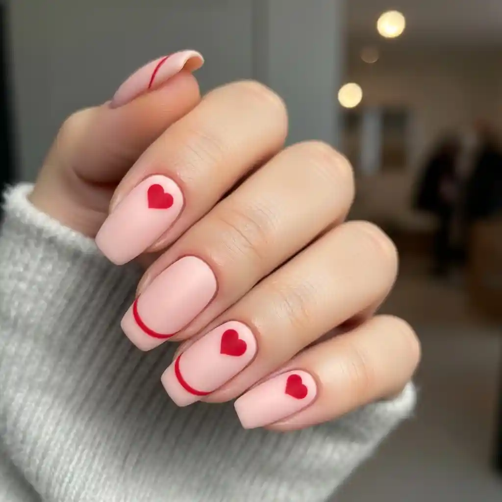 Matte red nails offer a bold yet velvety finish. Modern heart designs keep the look romantic without feeling traditional.