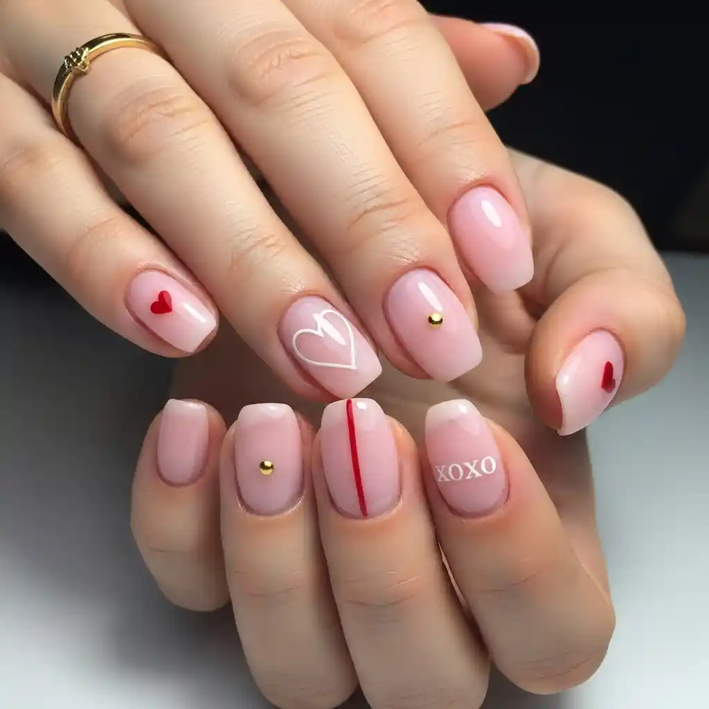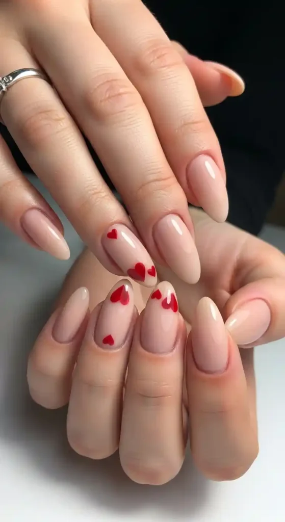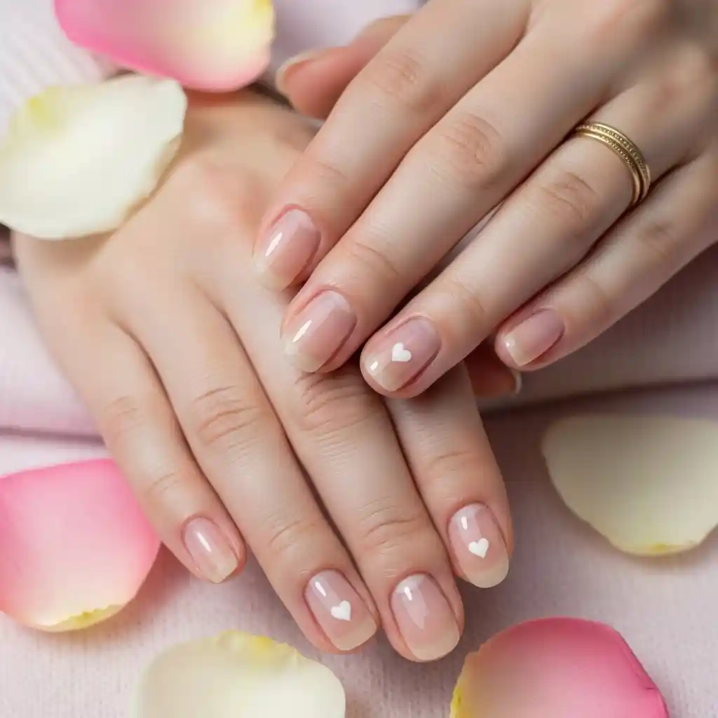 Classic nude nails are timeless and flattering on all skin tones. Minimal heart accents add a subtle Valentine touch.