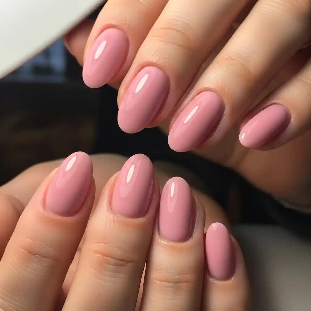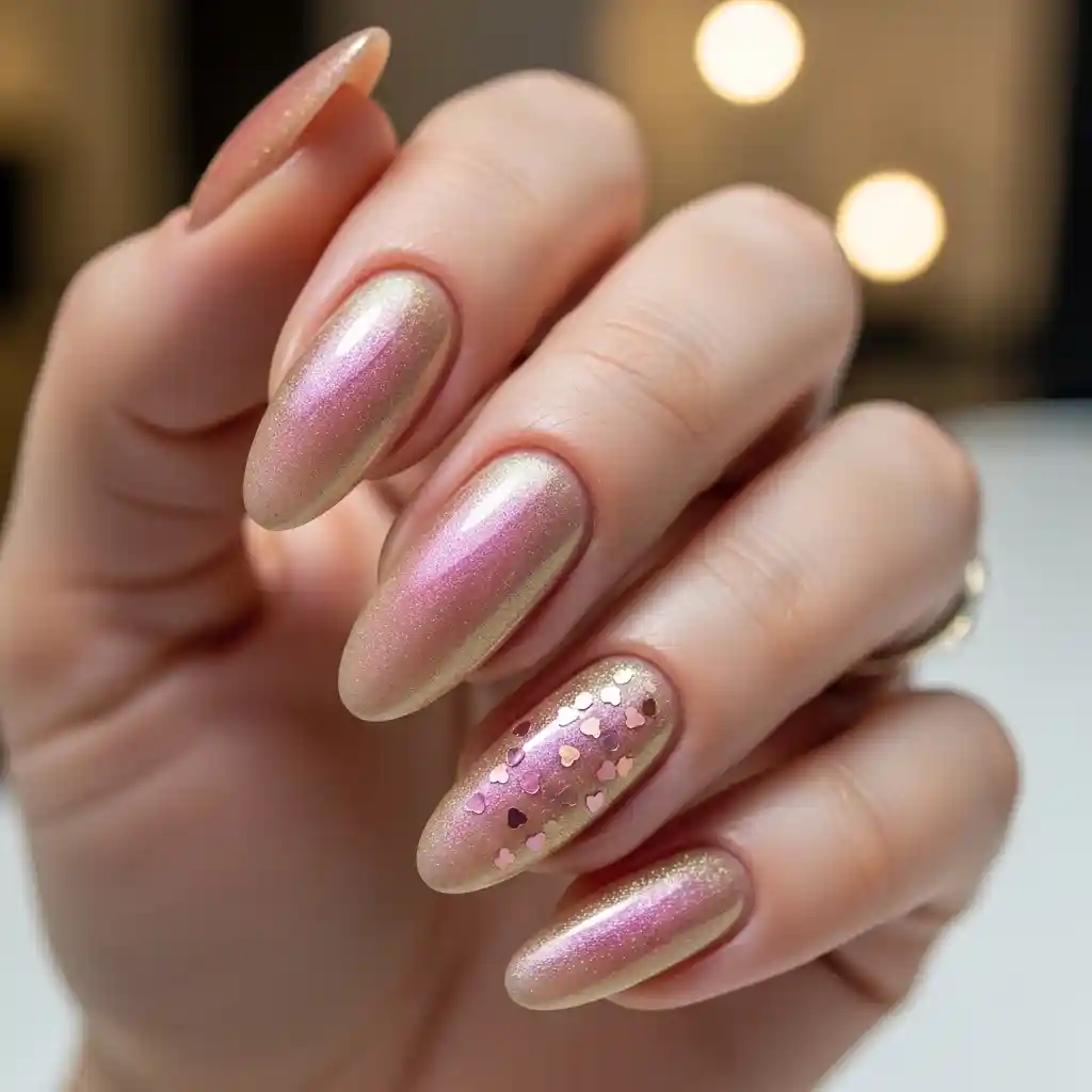 Adding subtle shimmer to nude nails enhances their elegance. The result is a refined Valentine’s Day manicure with gentle glow.