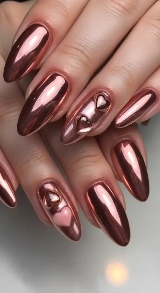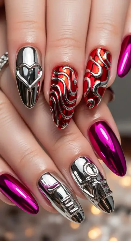 Chrome nails add a futuristic and glamorous feel to Valentine’s Day looks. They reflect light beautifully and make a strong statement.