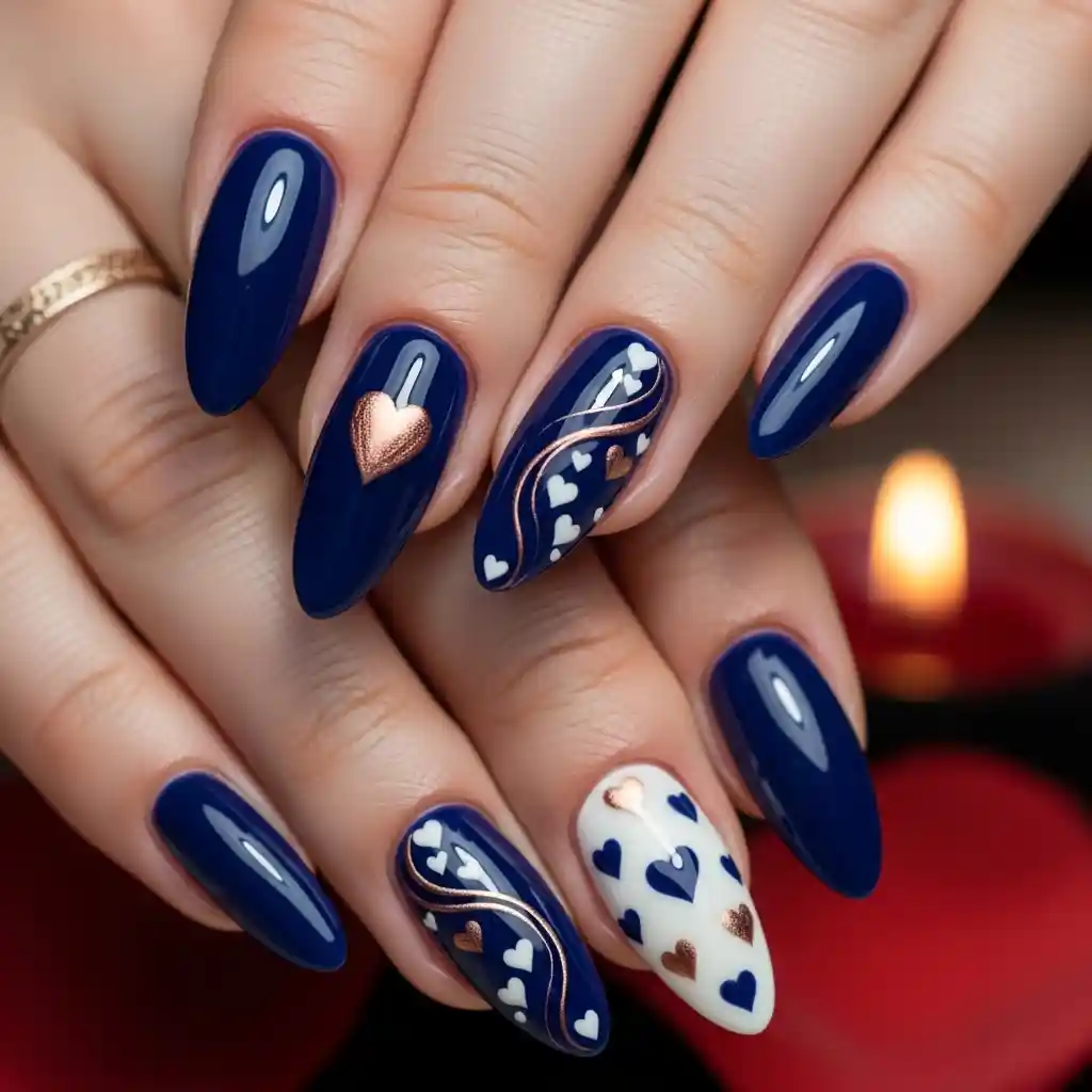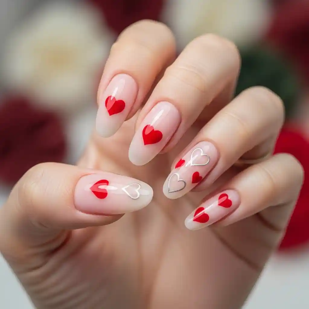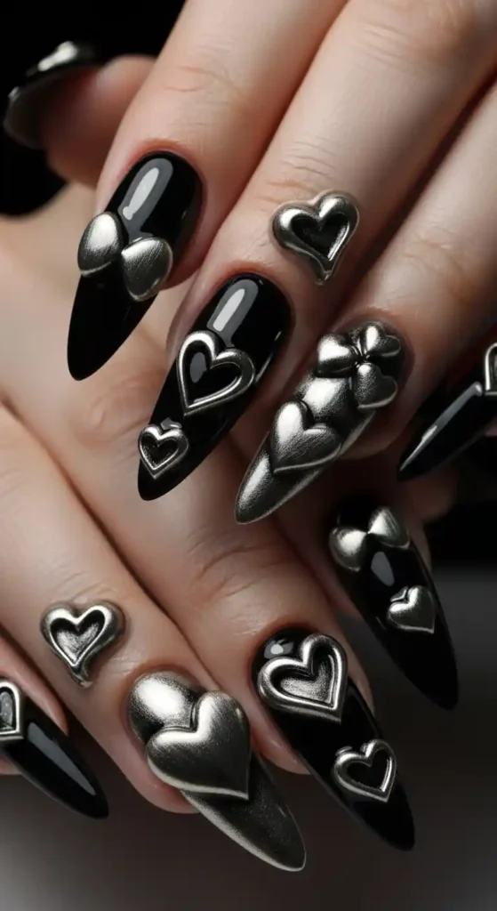 Metallic heart details stand out beautifully against a black base. This design is perfect for anyone who loves high-contrast Valentine’s Day nail ideas with a bold aesthetic.