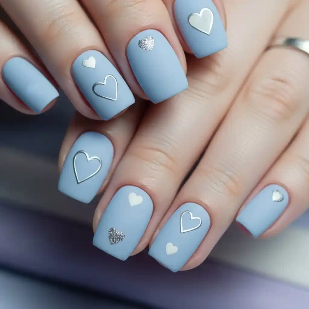 Soft blue polish offers a calm and romantic alternative to traditional Valentine colors. Delicate heart designs add charm while keeping the manicure light and wearable.