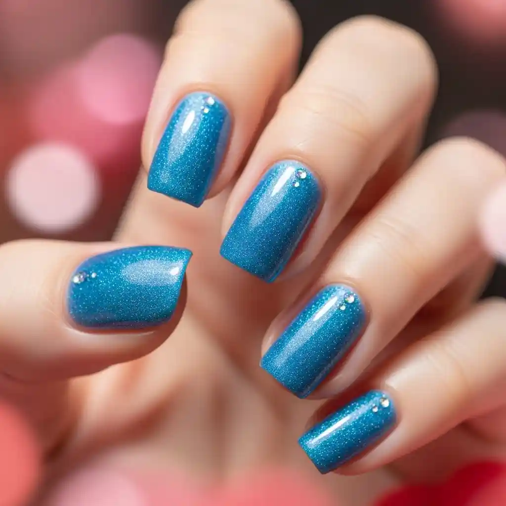 Adding shimmer accents to blue nails creates a soft glow without overwhelming the design. This style works beautifully for those who want understated sparkle.