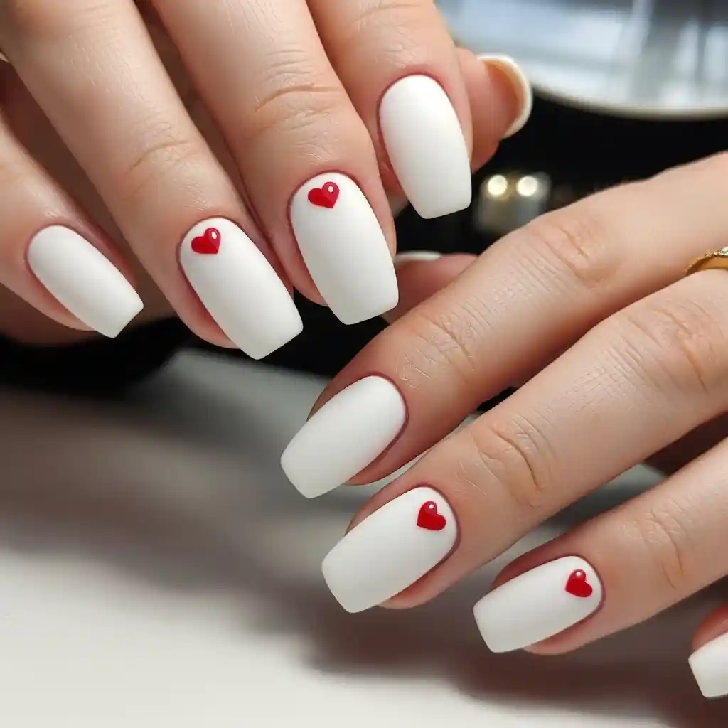 White polish provides a clean and timeless base for Valentine’s Day nails. Tiny heart details add romance while maintaining a minimalist appearance.